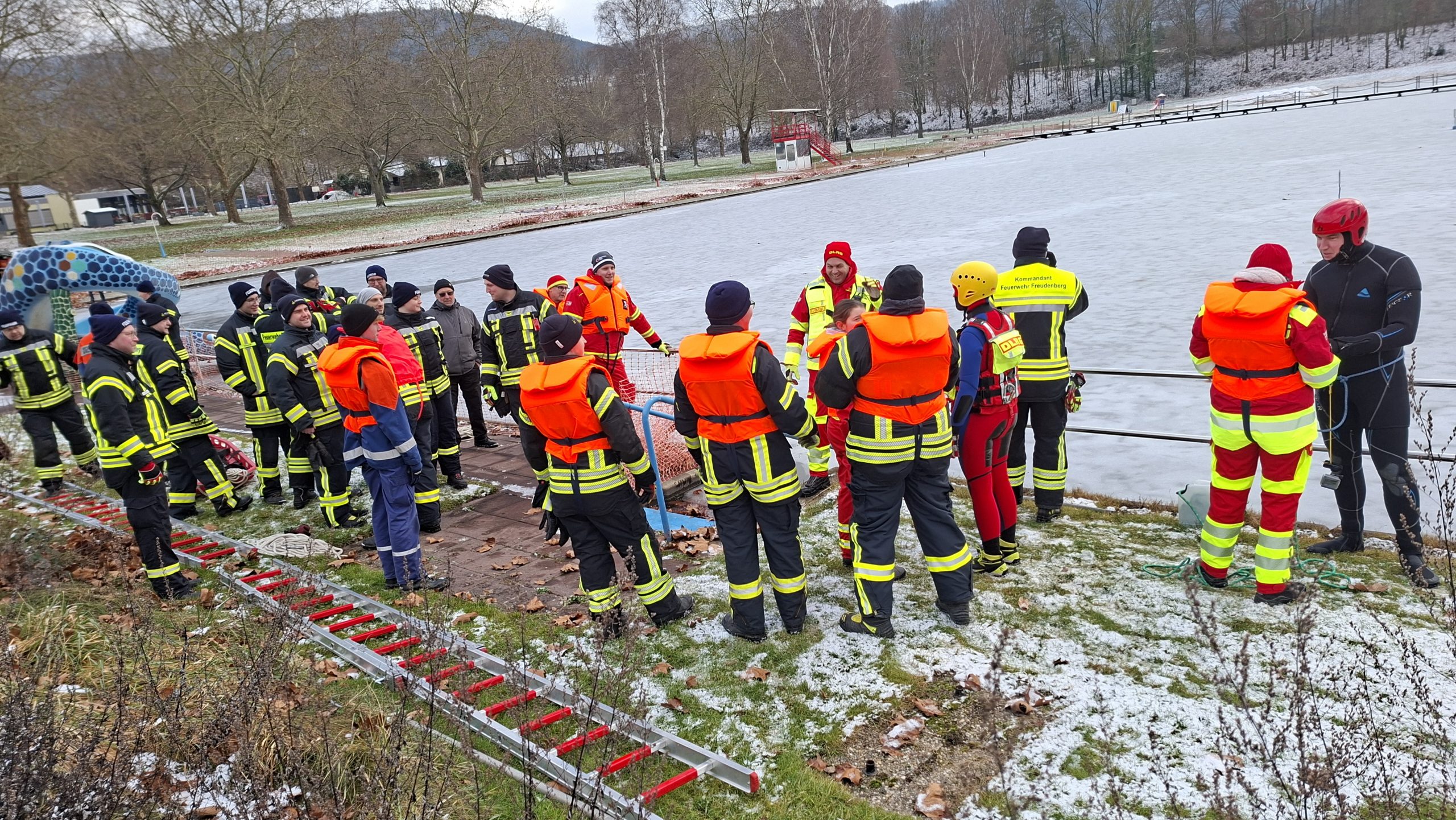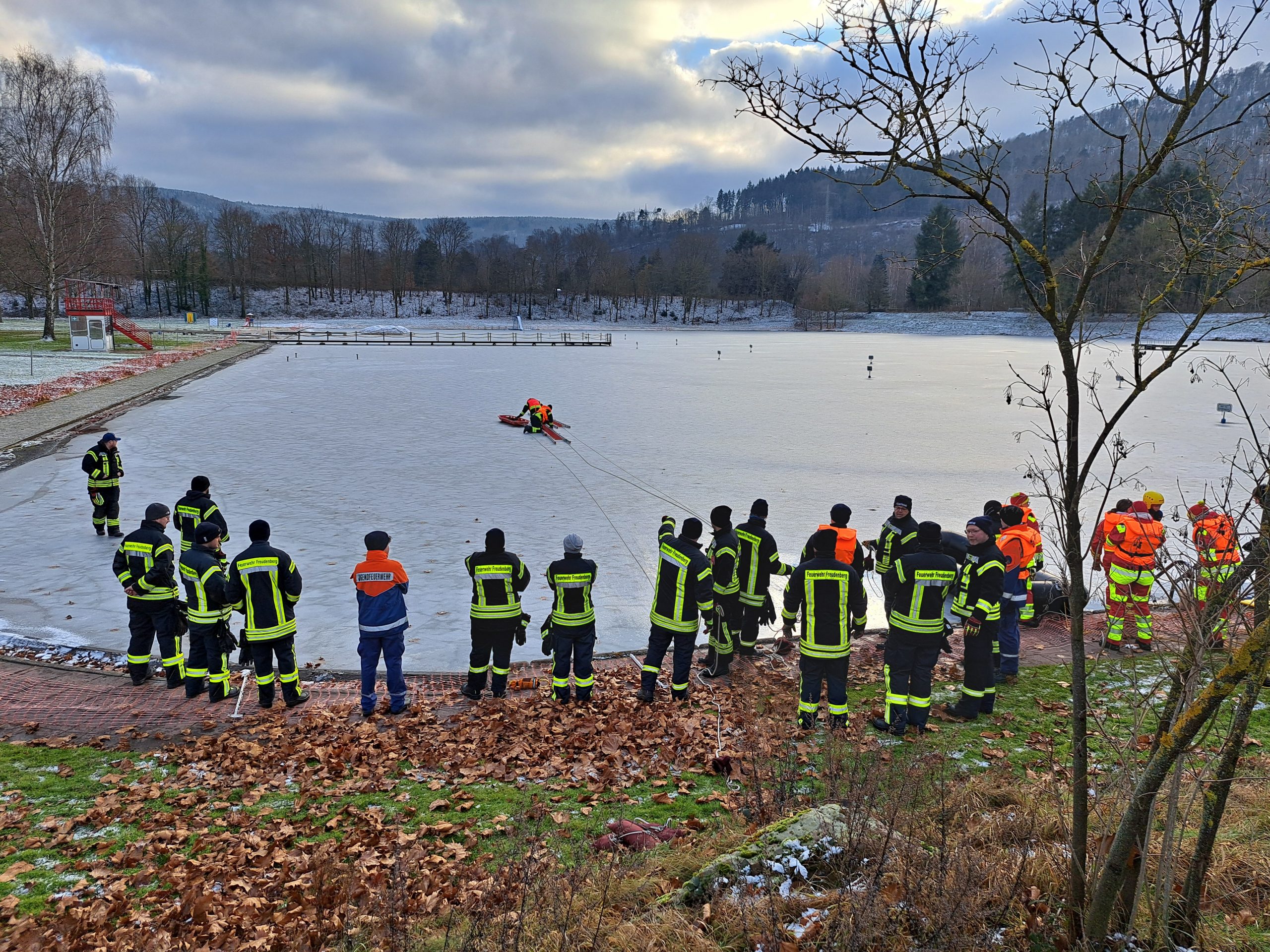 Bei winterlichen Temperaturen und einer geschlossenen, jedoch nicht tragfähigen Eisdecke fand am Sonntag, den 11. Januar 2026, eine realitätsnahe Eisrettungsübung am Badesee Freudenberg statt.