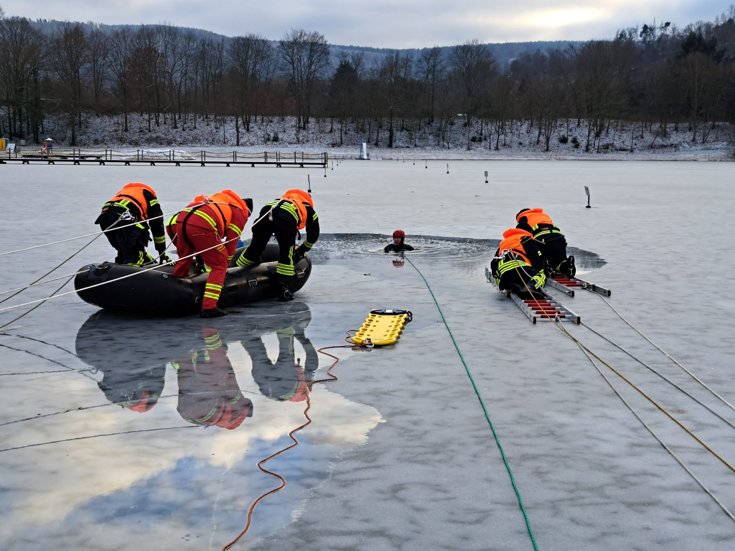 Geübt wurden das gesicherte Vorgehen auf dem Eis, die richtige Lastverteilung sowie die koordinierte Zusammenarbeit zwischen Feuerwehr und DLRG unter erschwerten Bedingungen. Besonderes Augenmerk lag dabei auf der Absicherung der Einsatzkräfte und der Rettung vom Eisrand aus.