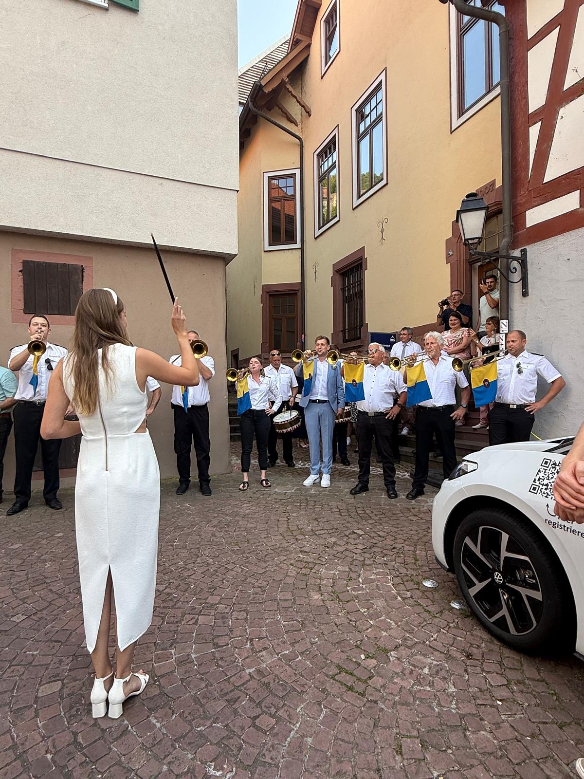 Wir empfingen die beiden mit einem Schlauchbogen und Klängen der Fanfaren. Christian, als Mitglied des Fanfarenzugs, durfte anschließend mitspielen und Elena dazu den Takt angeben.